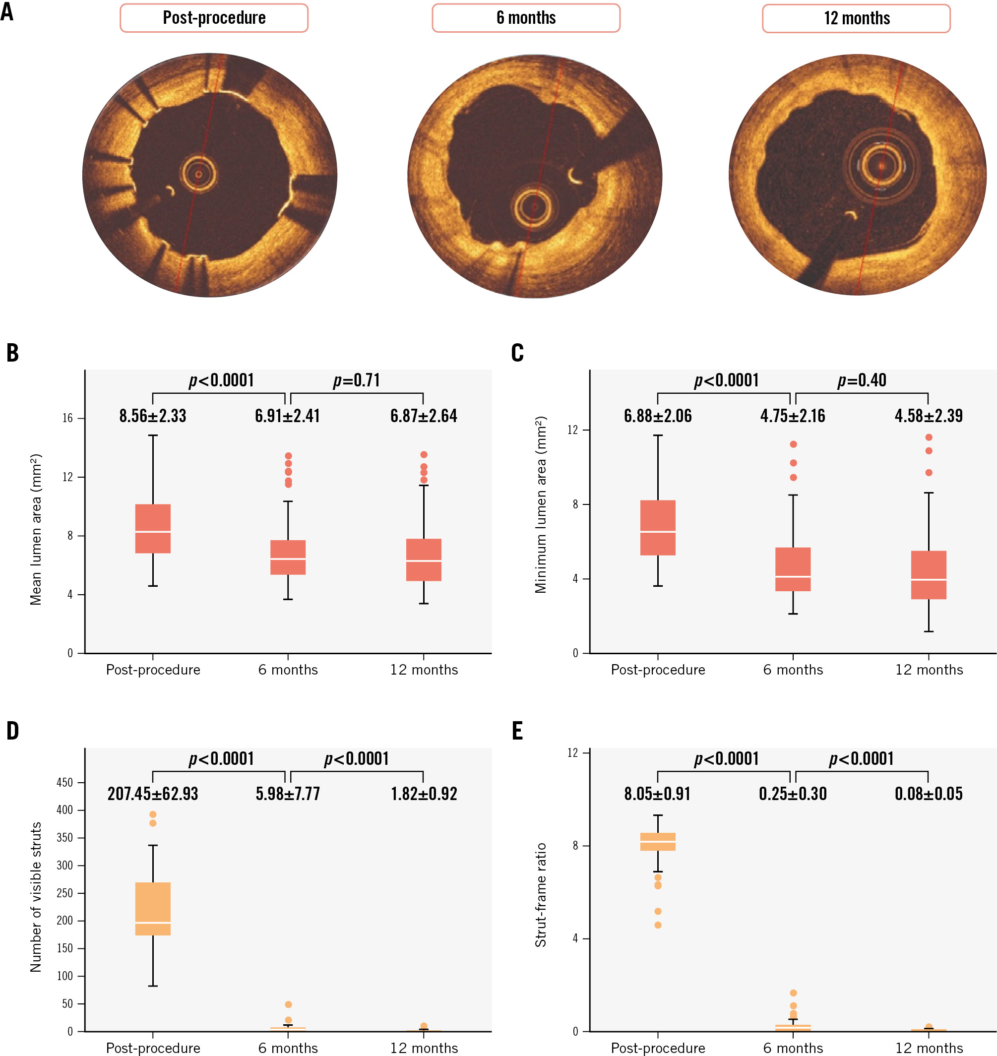 Figure 1. Temporal changes in mean and minimum lumen area, number of visible struts, and strut-frame ratio at each time-point. A) Representative OCT images at each timepoint. The box plots indicate temporal changes in mean lumen area (B), minimum lumen area (C), number of visible struts (D), and strut-frame ratio (E) at each timepoint. OCT: optical coherence tomography