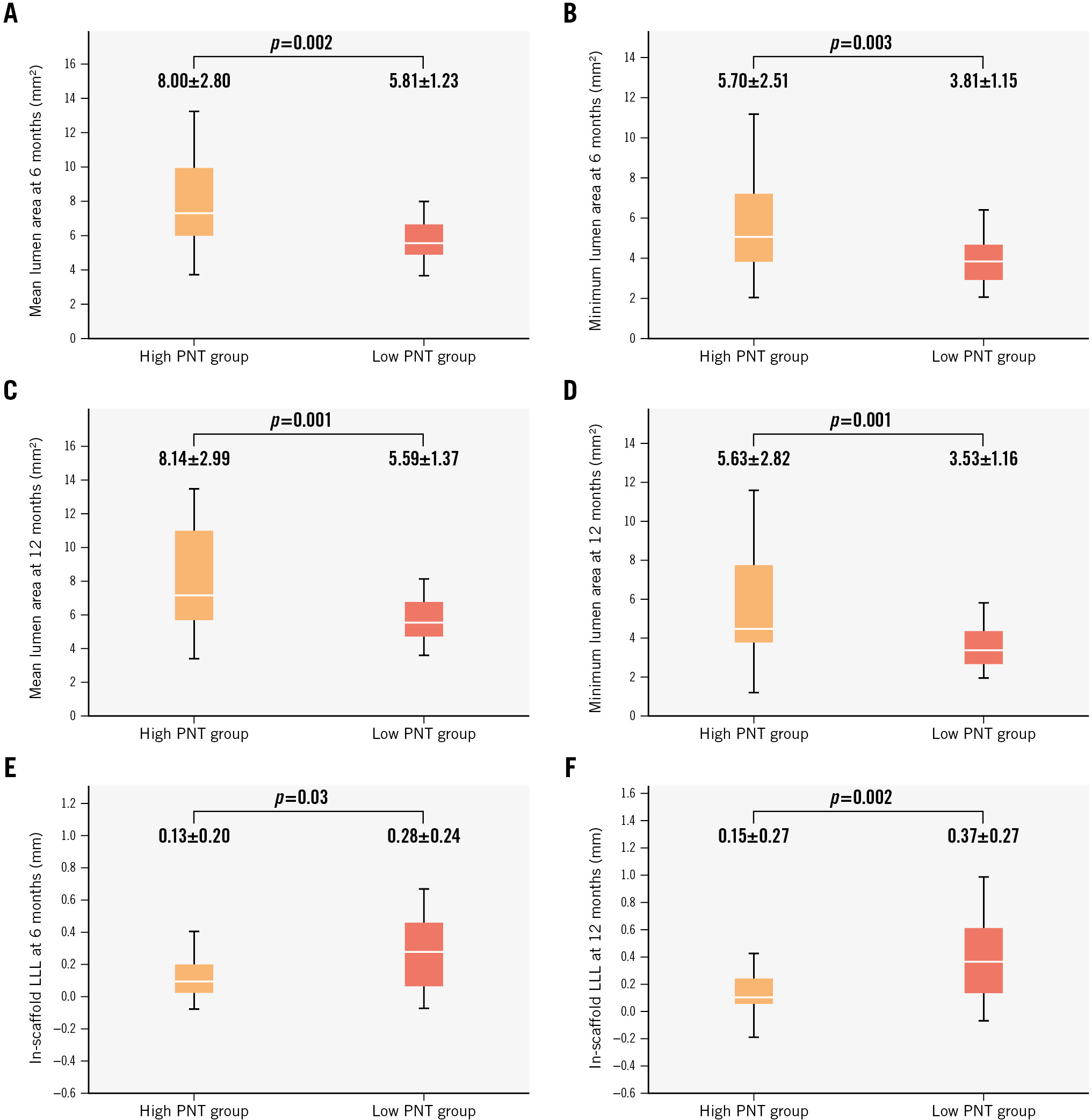 The Central illustration illustrates the time course of lumen and vessel areas in the present study. OCT-derived mean and minimum lumen areas were significantly larger in the high PNT group compared to the low PNT group at the 6- and 12-month follow-up (Figure 2A-D). Concerning the change in mean and minimum lumen areas between post-procedure and 6 months, these areas showed a significantly smaller decrease in the high PNT group compared to the low PNT group (delta of mean lumen area: high PNT group −1.12±1.73 mm2, low PNT group −2.18±1.16 mm2; p=0.01; delta of minimum lumen area: high PNT group −1.65±1.46 mm2, low PNT group −2.59±1.43 mm2; p=0.02) (Table 3).