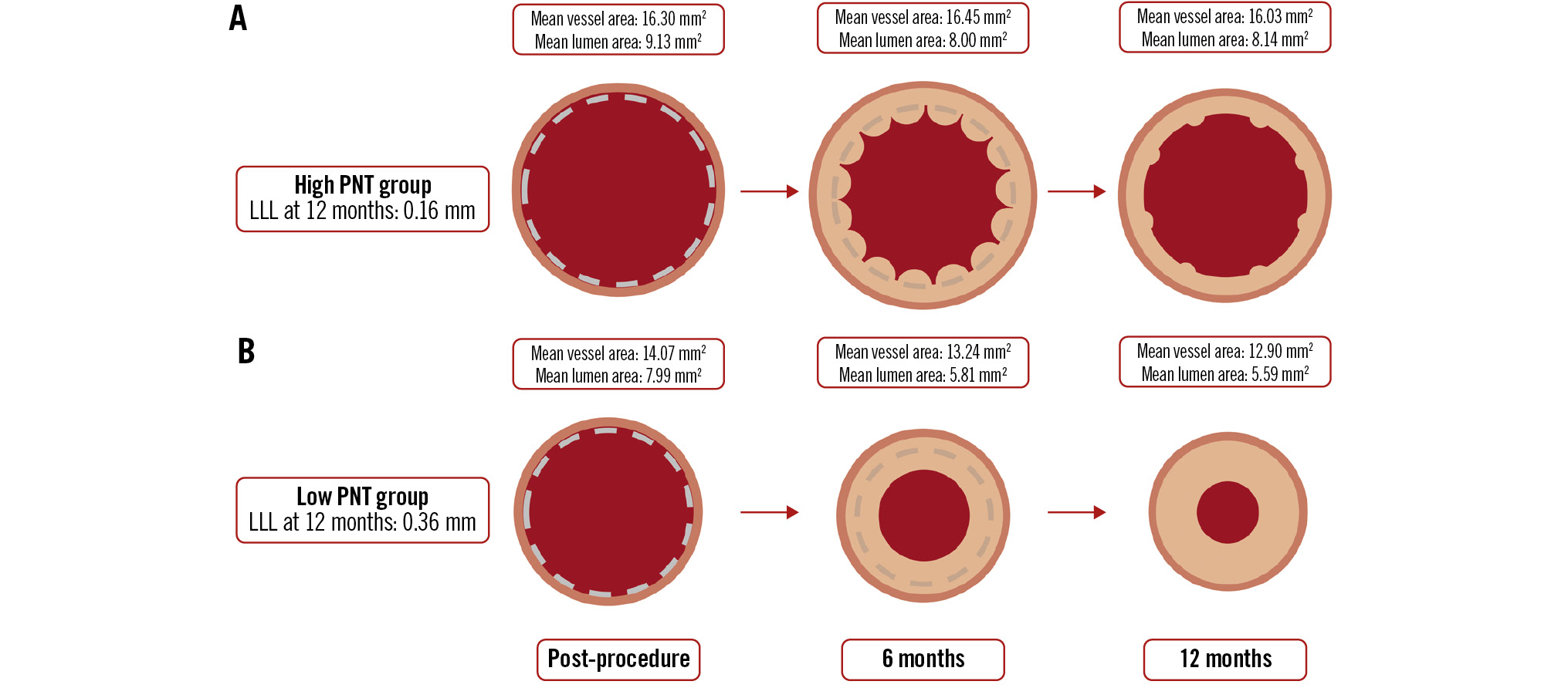 Central illustration. Temporal changes in lumen and vessel areas. Temporal changes of lumen and vessel areas in the high and low PNT groups. A) Illustrates the time course of the high PNT group, while (B) represents the low PNT group. Lumen area was measured using OCT images, while scaffold and vessel area assessments were conducted using IVUS. IVUS: intravascular ultrasound; LLL: late lumen loss; OCT: optical coherence tomography; PNT: protruding neointimal tissue
