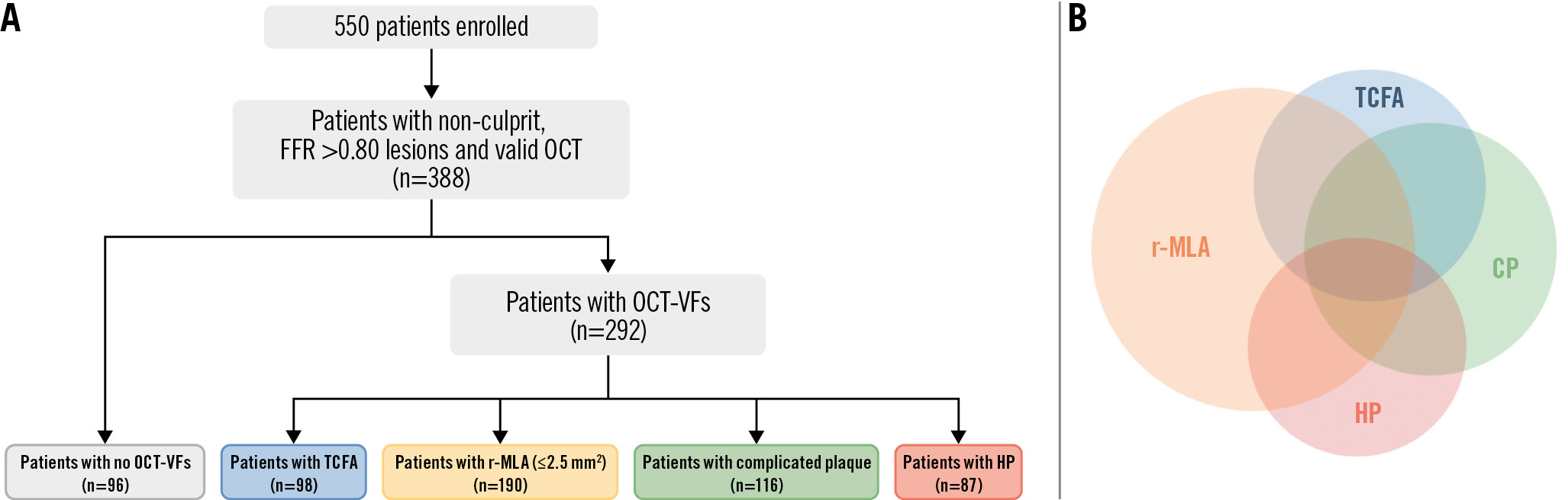 Figure 1. Flowchart of the study population. A) From a total of 550 diabetic patients, 388 with non-culprit, FFR-negative target lesions who underwent OCT assessment were included in the analysis. Among the 292 (75.3%) patients who presented lesions with at least 1 OCT-VF, 98, 190, 116 and 87 patients showed TCFA, r-MLA, HP, and CP, respectively; 96 (24.7%) patients had none of these VFs. B) Distribution and overlap of OCT-VFs in the entire cohort. CP: complicated plaque; FFR: fractional flow reserve; HP: healed plaque; OCT: optical coherence tomography; OCT-VFs: OCT-detected vulnerability features; r-MLA: reduced minimal lumen area; TCFA: thin-cap fibroatheroma