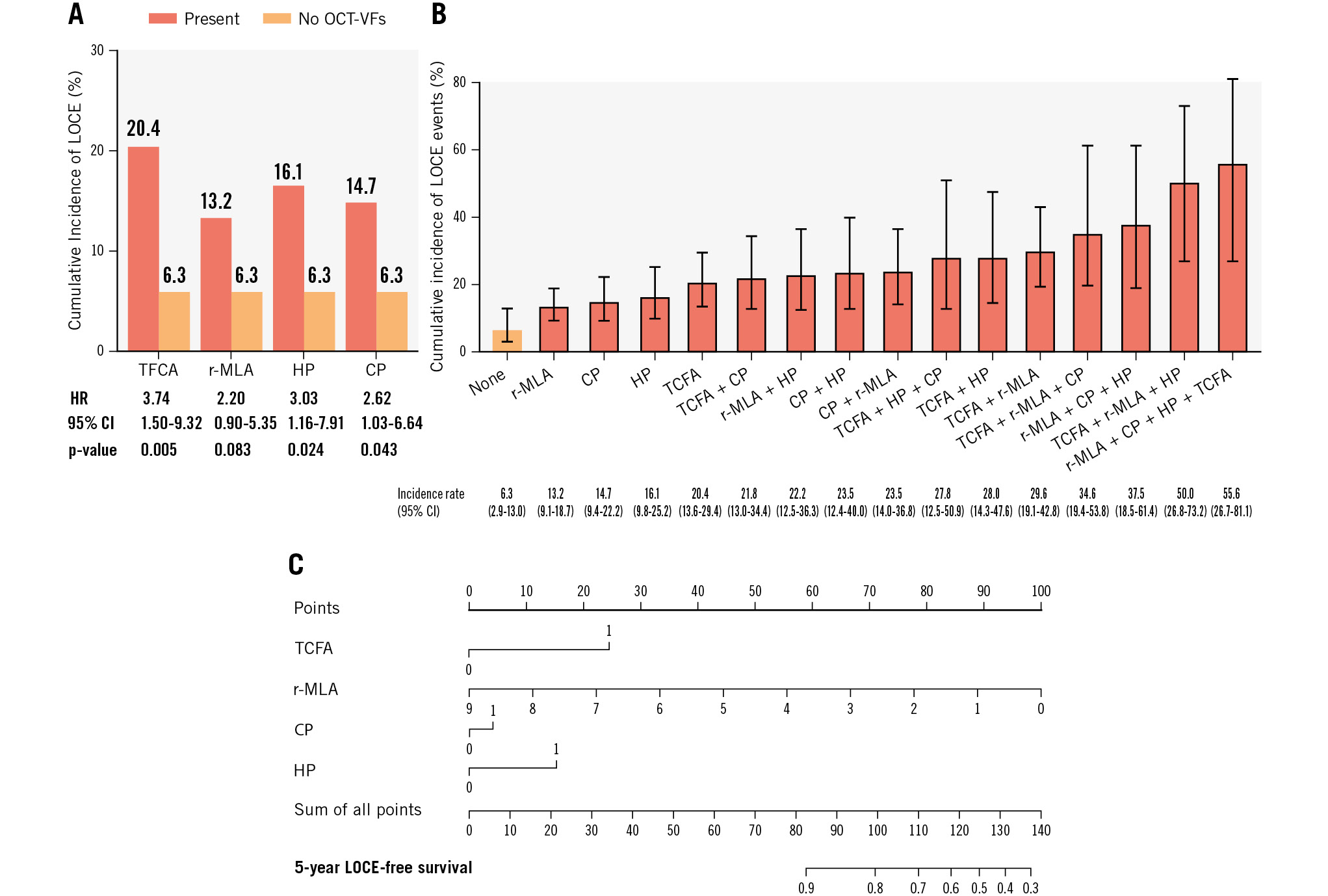 Figure 2. Main results. A) Cumulative incidence of LOCE events in patients with lesions exhibiting different OCT-VFs compared to those without any OCT-VFs. B) Cumulative incidence rate of the primary endpoint (LOCE) with different combinations of OCT-VFs. C) The risk-scoring model for predicting 5-year LOCE-free survival based on the presence of OCT-VFs (r-MLA was considered a continuous variable. TCFA, CP and HP were considered dichotomous variables). CI: confidence interval; CP: complicated plaque; HP: healed plaque; HR: hazard ratio; LOCE: lesion-oriented composite endpoint; r-MLA: reduced MLA; OCT-VFs: optical coherence tomography-detected vulnerability features; TCFA: thin-cap fibroatheroma