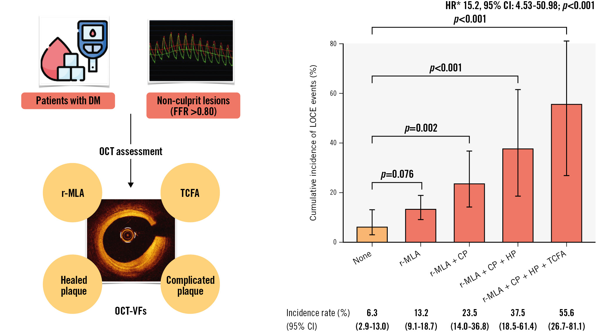 METHODS: COMBINE OCT-FFR (ClinicalTrials.gov: NCT02989740) was a prospective, double-blind, international, natural history study that included DM patients with ≥1 non-culprit lesions with a fractional flow reserve>0.80 undergoing systematic OCT assessment. OCT-VFs included the following: TCFA, reduced minimal lumen area (r-MLA), healed plaque (HP), and complicated plaque (CP). The primary endpoint, LOCE − a composite of cardiac mortality, target vessel myocardial infarction, or clinically driven target lesion revascularisation up to 5 years − was analysed according to the presence of these OCT-VFs, both individually and in combination.