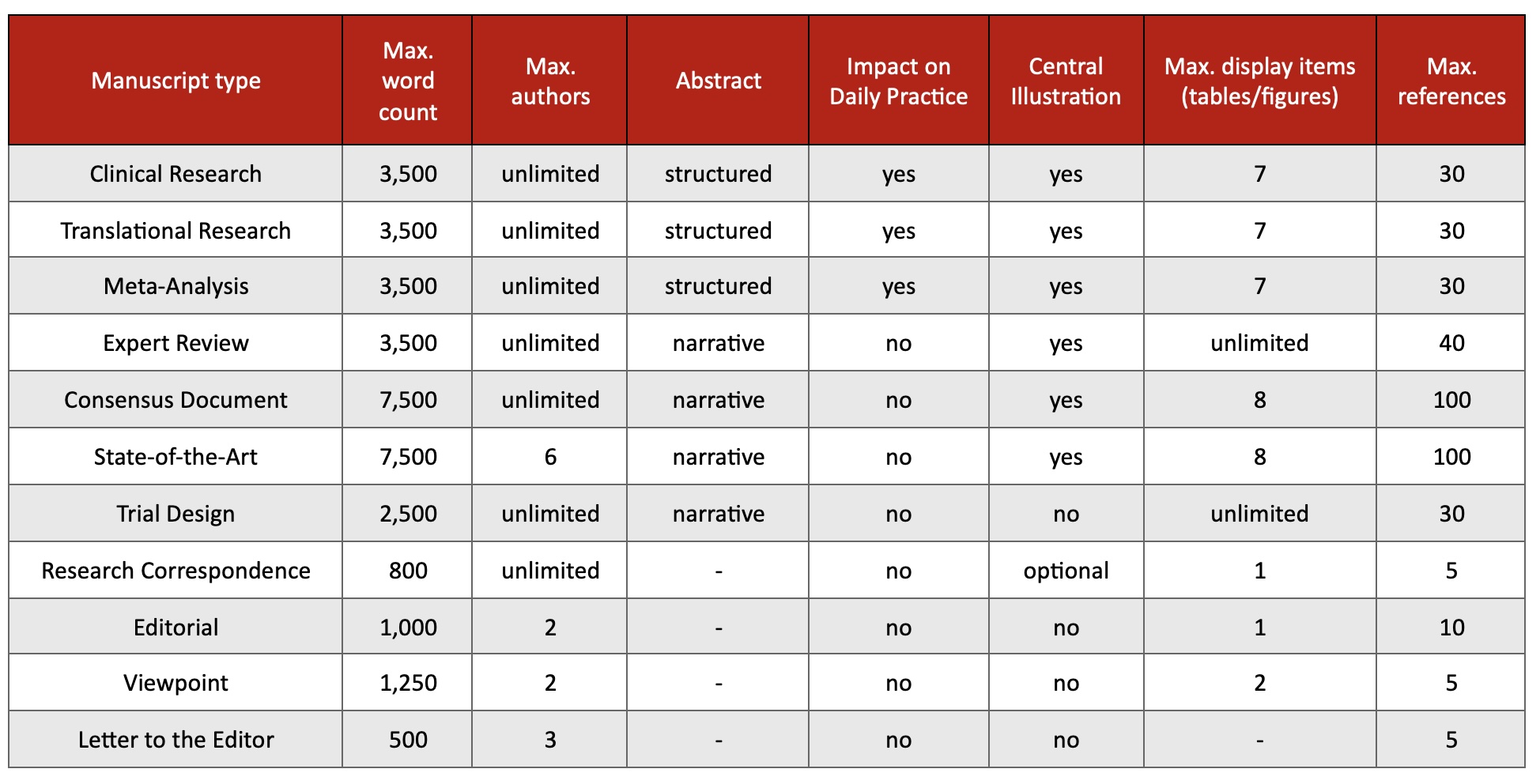 All word count limits are intended for the text from the introduction to the conclusion, and they exclude abstract, figure legends, and table notes. For any text exceeding the word limit, upload of supplementary material is permitted. For some categories, a Central Illustration and/or a panel named “Impact on daily practice” is required.